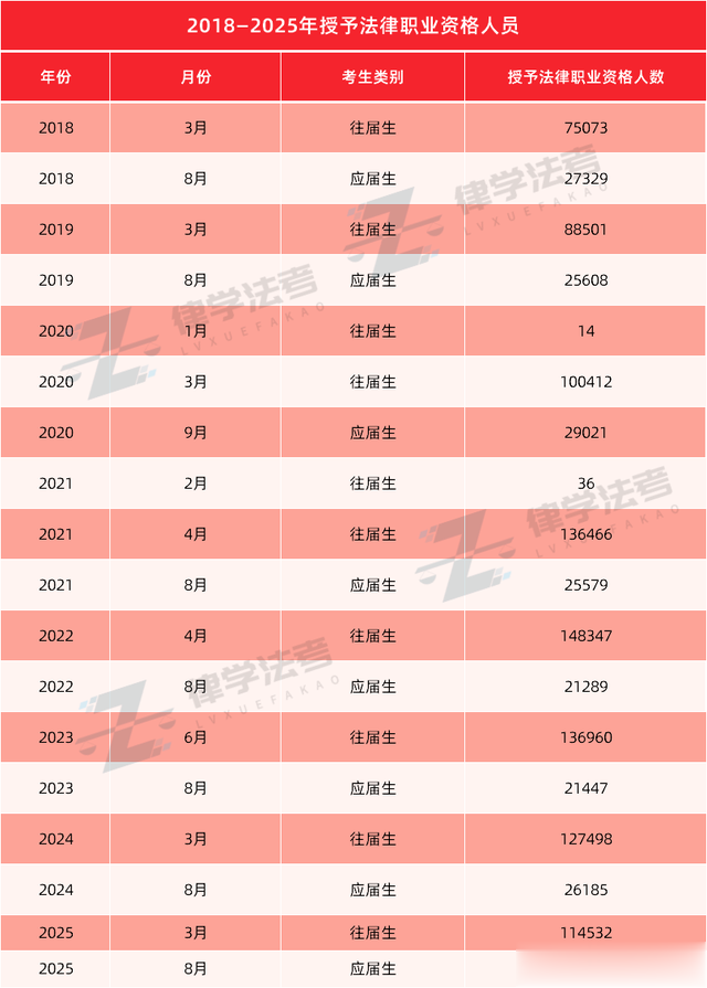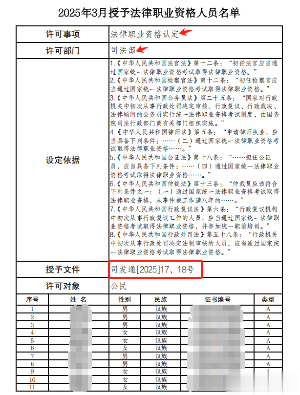 2025年4月8日,司法部发布《2025年3月授予法律职业资格人员名单》,这份文档长达2295页,共有114612名(含历年补发证书人数)往届生被授予法律职业资格,2024年通过114532人(比去年减少12906人,同比下降11.26%),其中A证96762人,占比84.38%;B证504人,占比0.44%;C证17266人,占比15.07%。