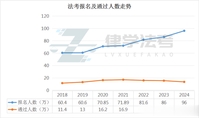 4、N年参加法考并通过客观题和主观题,N+1授予法律职业资格证书,因此2025年3月授予人数即2024年往届生通过人数,(通过总人数=往届生通过人数+应届生通过人数=11.4+2.1=13.5),因此2024年法考通过人数预计13.5万人,2018年法考改革以来,法考客观题报名人数一路飙升,分子变小、分母变大(法考通过率=通过总人数/参考总人数),因此2024年法考通过率大概率是下降。
